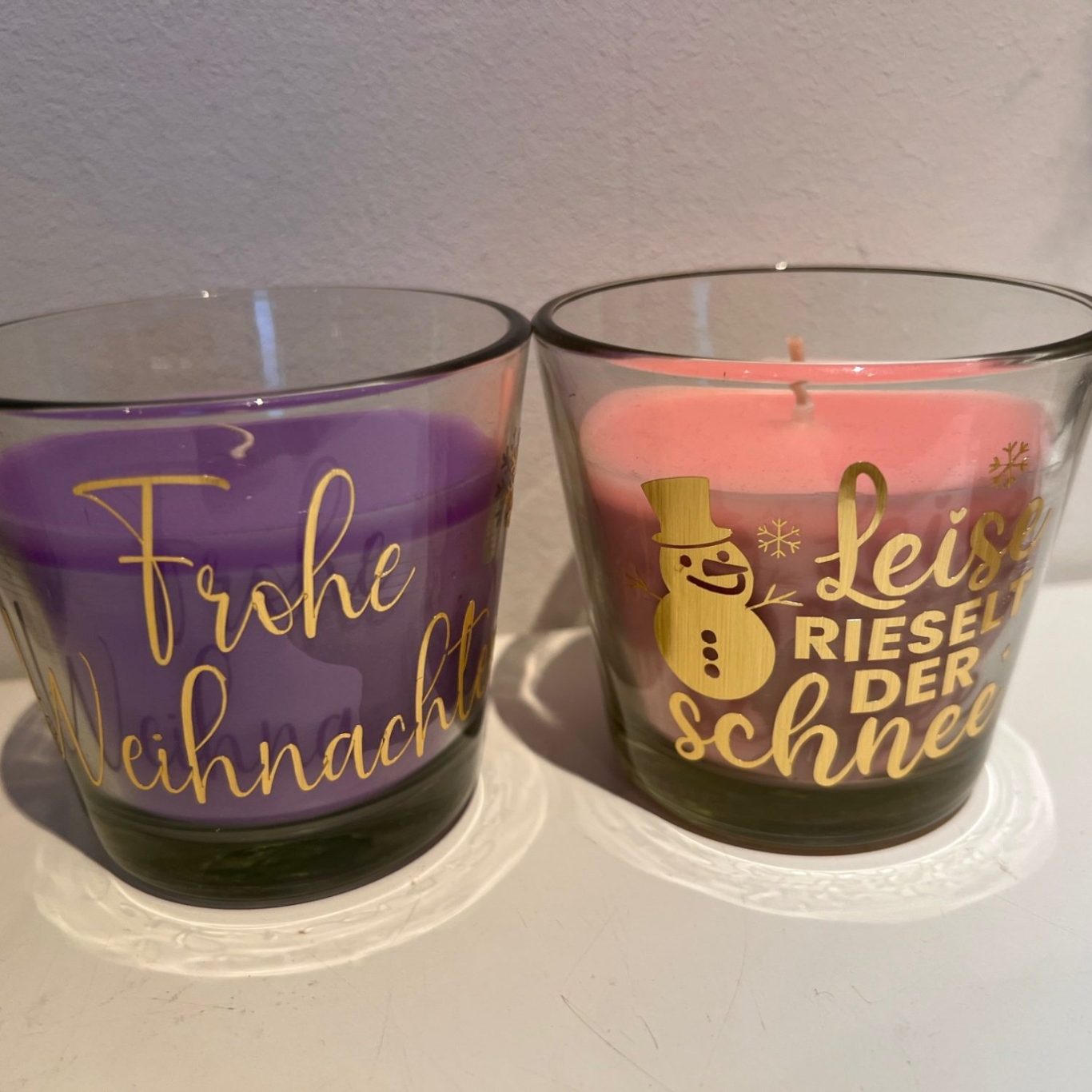 Ich biete individuell beplottete Produkte wie Dekorationen, Kerzen, T-Shirts, Schriftzüge, Namen und weitere personalisierte Artikel zum Verkauf an.